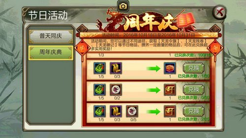 经过四大恶人以及高档藏宝图、国际boss等取得【天龙残卷】;经过灵鹫副本、楼兰鬼窟以及每日答题中取得【天龙徽记】。成功集齐以上三种道具的少侠,祝贺你离领奖只差一步啦!点击页面上节日-进入周年庆典活动界面,即可兑换天龙周年系列礼品~!